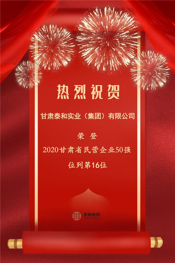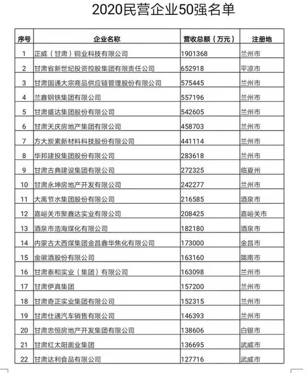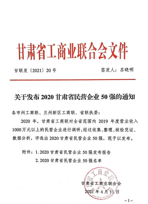 世界杯真钱买球app2020年,甘肃省工商联对全省范围内2019年度营业收入1000万元以上的民营企业进行调研,经过收集、整理、核验凭证、数据分析,评选出2020甘肃省民营企业50强。4月13日上午,甘肃省工商业联合会(民间商会)十二届五次执委会议上发布了2020甘肃省民营企业50强名单,我司荣登榜单,位列第16位。